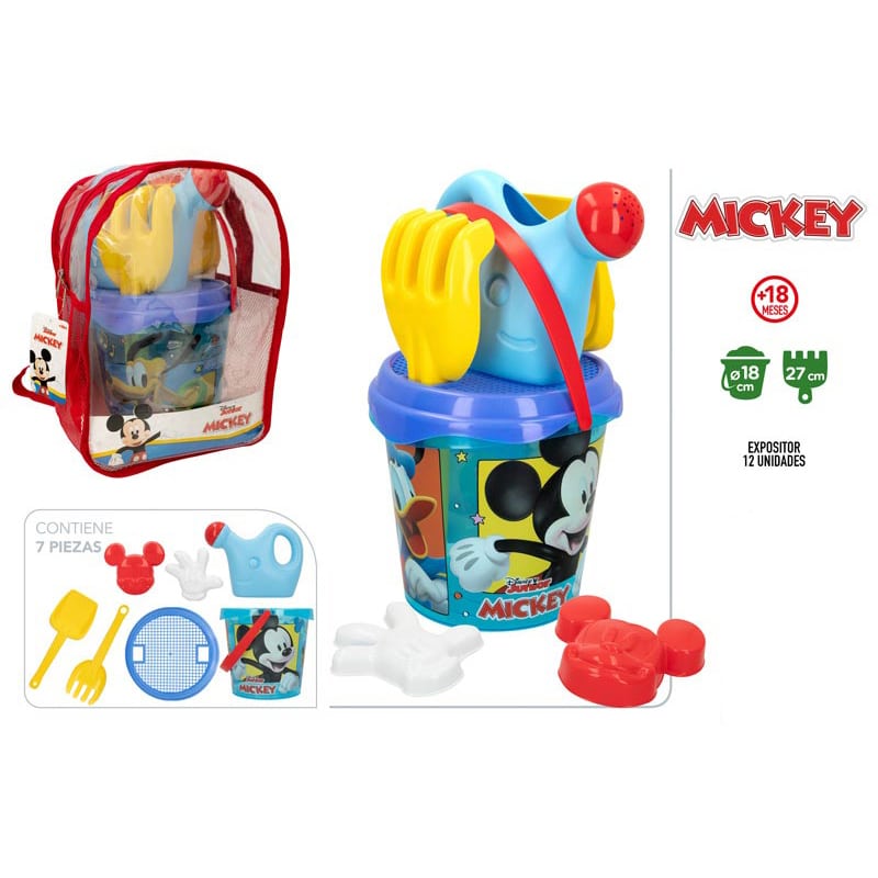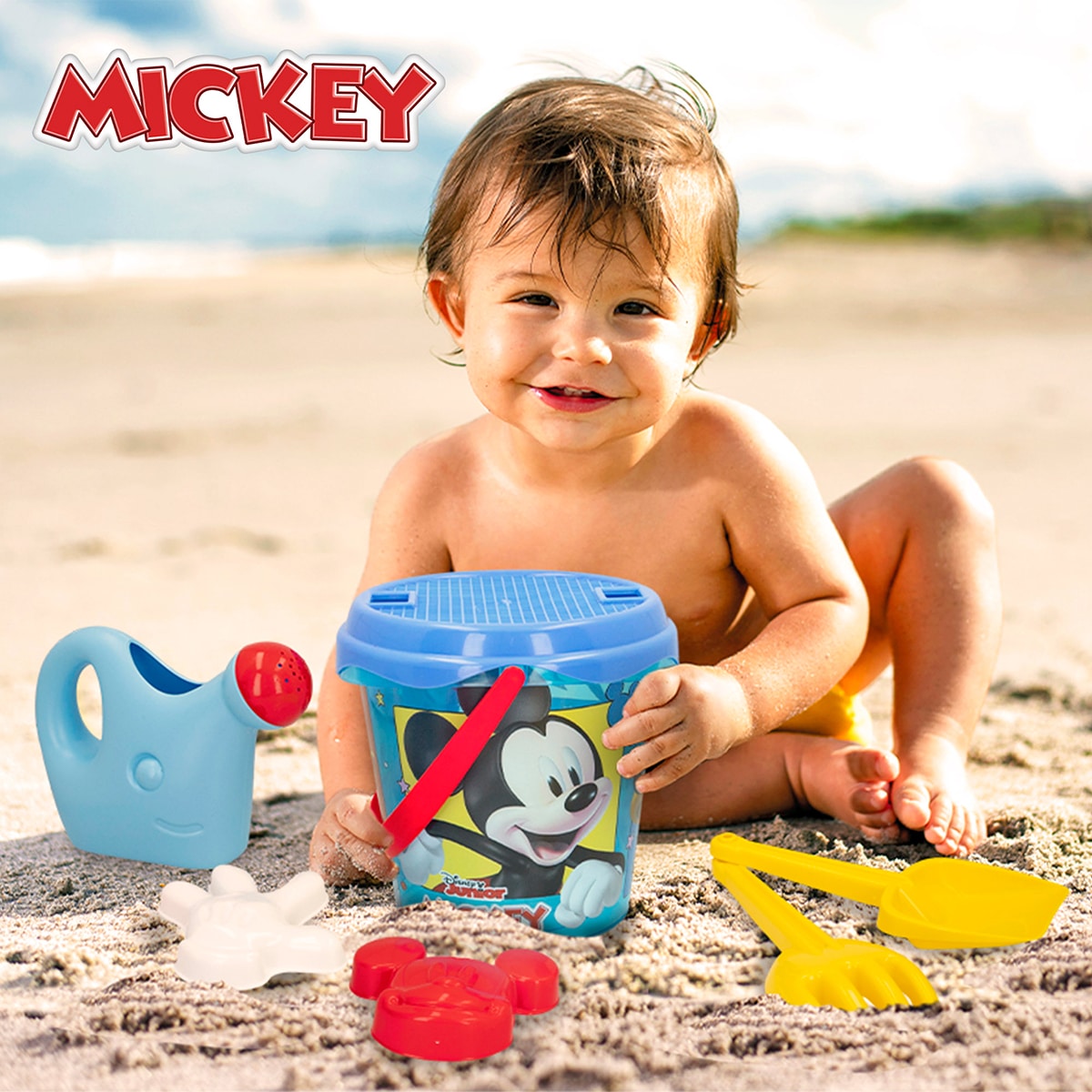- Inclui 7 peças: balde com pega, pá, ancinho, peneira, regador e 2 moldes (rosto e luva do Mickey);