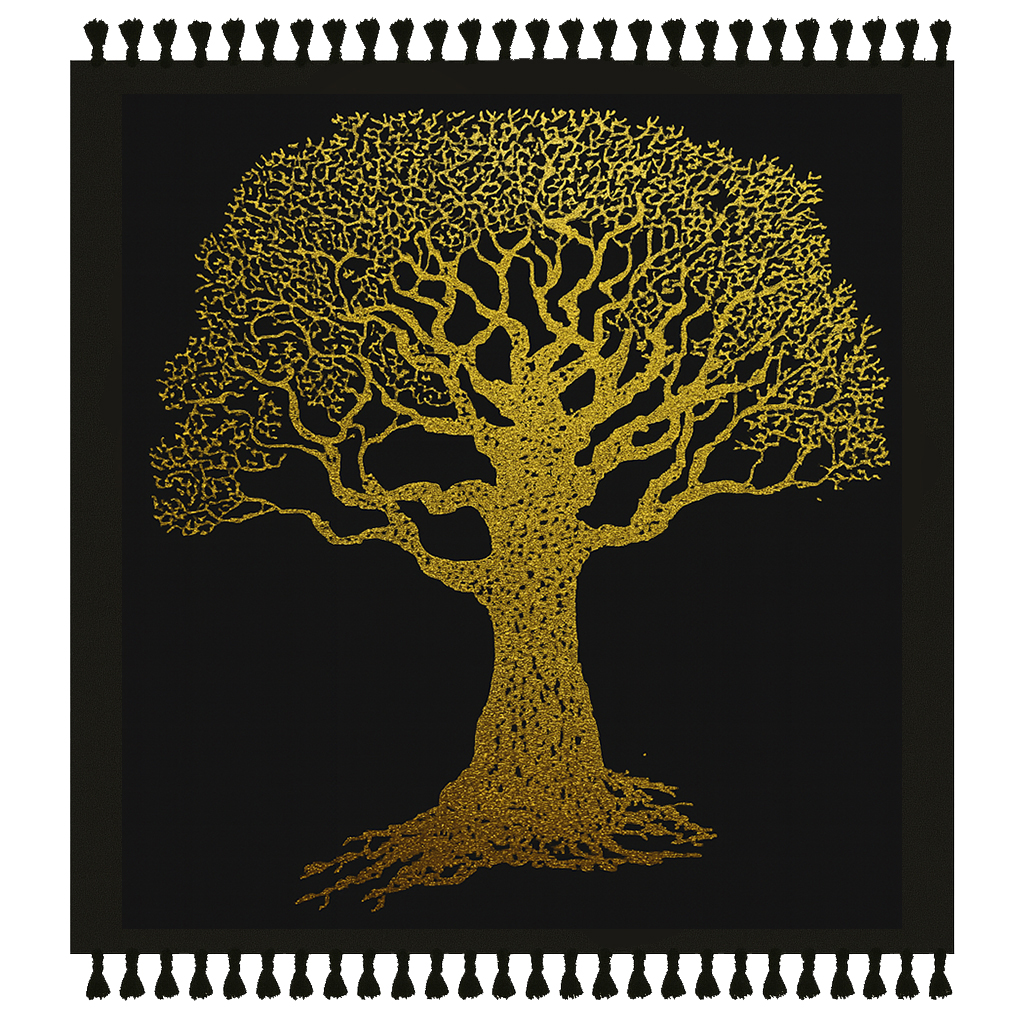 - Design elegante e simbólico – fundo preto intenso com Árvore da Vida em estampado dourado brilhante ao centro;